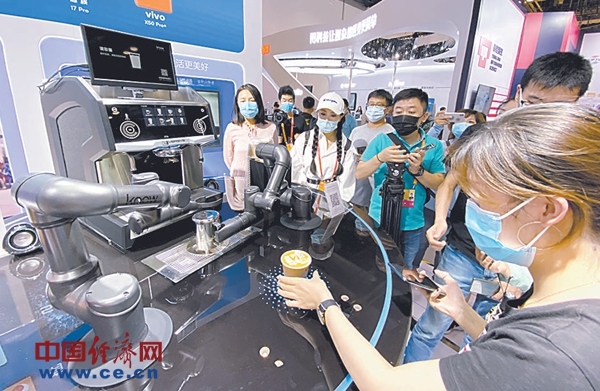 在綜合展區(qū)高通展臺,觀眾們排隊體驗機器人制作的拉花咖啡。經(jīng)濟日報-中國經(jīng)濟網(wǎng)記者袁勇攝