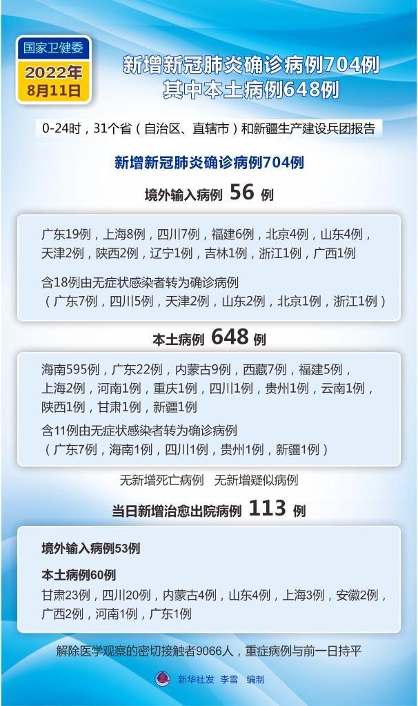 新華社北京8月12日電 國家衛(wèi)生健康委員會8月12日通報,8月11日0—24時,31個省(自治區(qū)、直轄市)和新疆生產(chǎn)建設(shè)兵團報告新增確診病例704例。其中境外輸入病例56例(廣東19例,上海8例,四川7例,福建6例,北京4例,山東4例,天津2例,陜西2例,遼寧1例,吉林1例,浙江1例,廣西1例),含18例由無癥狀感染者轉(zhuǎn)為確診病例(廣東7例,四川5例,天津2例,山東2例,北京1例,浙江1例);本土病例648例(海南595例,廣東22例,內(nèi)蒙古9例,西藏7例,福建5例,上海2例,河南1例,重慶1例,四川1例,貴州1例,云南1例,陜西1例,甘肅1例,新疆1例),含11例由無癥狀感染者轉(zhuǎn)為確診病例(廣東7例,海南1例,四川1例,貴州1例,新疆1例)。無新增死亡病例。無新增疑似病例。