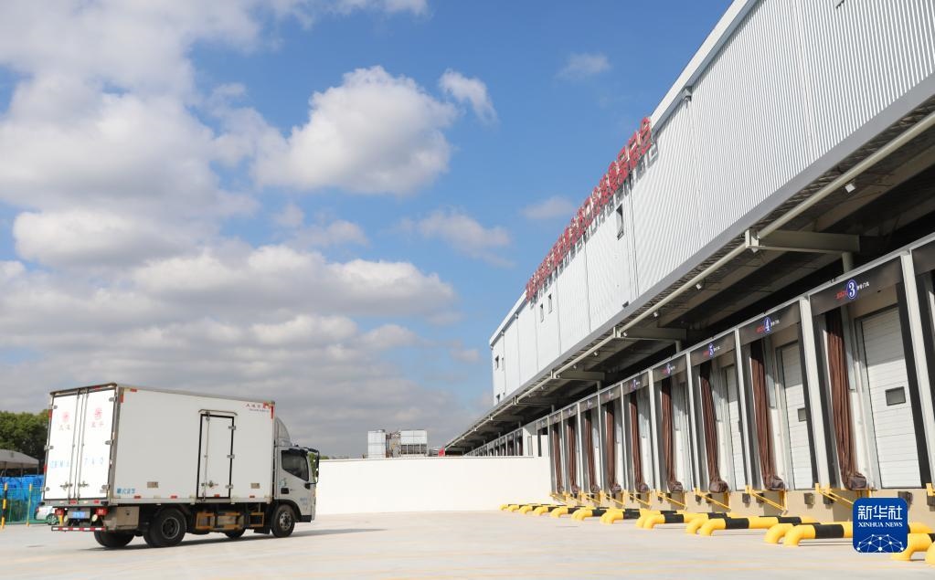 10月20日,裝載第一批進口冷鏈?zhǔn)称氛蛊返目ㄜ囻側(cè)肟倐}卸貨區(qū)域。新華社記者 方喆攝