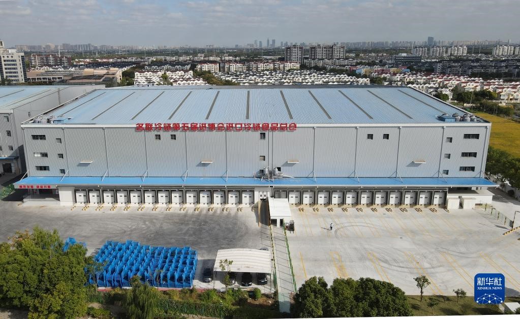 10月20日,空中俯瞰位于上海青浦區(qū)的名聯(lián)冷鏈第五屆進博會進口冷鏈?zhǔn)称房倐}(無人機照片)。新華社記者 方喆攝