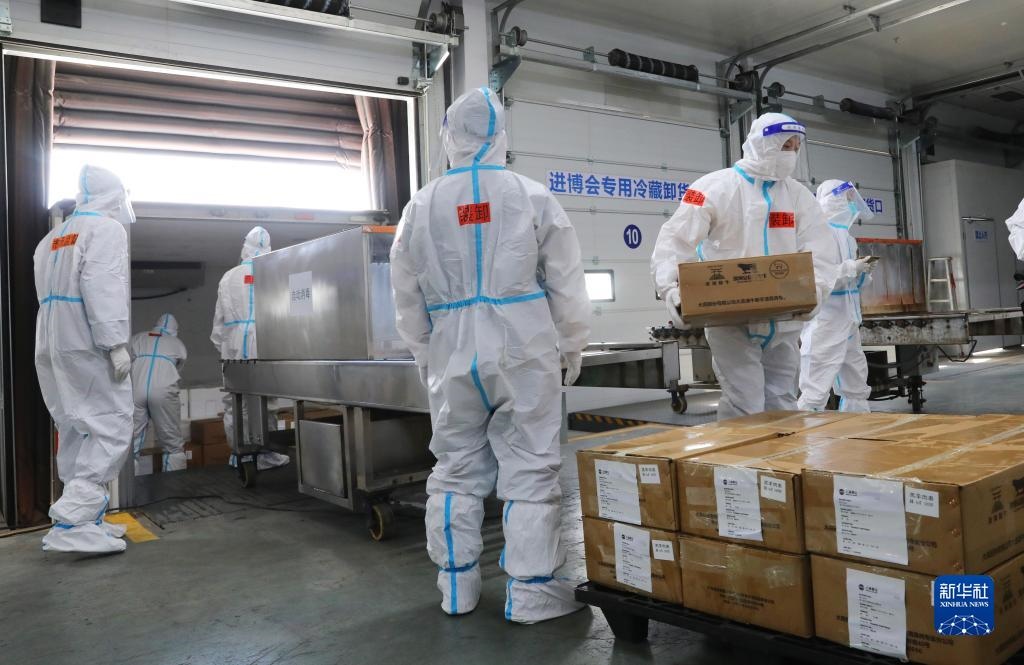 10月20日上午9點,第五屆中國國際進口博覽會的第一批進口冷鏈?zhǔn)称氛蛊繁贿\入總倉。在接下來的10天內(nèi),預(yù)計約100個全球參展商、3000箱冷鏈?zhǔn)称氛蛊?,將在總倉集中完成“最小包裝”消毒和核酸檢測。