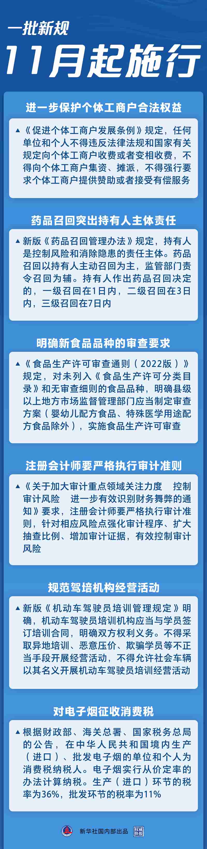 這個11月,一批民生新規(guī)開始施行,影響社會生活諸多方面。保護個體工商戶合法權(quán)益、規(guī)范駕培機構(gòu)經(jīng)營活動、完善藥品召回分級制度……更完善的法治,讓你我更有獲得感。
