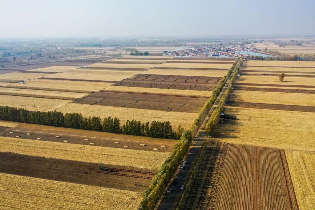 10月25日,在內(nèi)蒙古自治區(qū)通遼市開魯縣東風(fēng)鎮(zhèn),一些地塊上的玉米和紅干椒已經(jīng)收割結(jié)束。(無人機(jī)照片)新華社記者連振 攝
