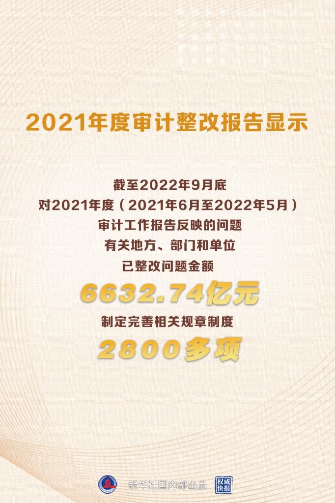 新華社北京12月28日電(記者鄒多為)報告顯示,截至2022年9月底,對于2021年度(2021年6月至2022年5月)審計工作報告反映的問題,有關(guān)地方、部門和單位已整改問題金額6632.74億元,制定完善相關(guān)規(guī)章制度2800多項,追責(zé)問責(zé)1.4萬人,糾治了一些阻礙改革發(fā)展和長期未解決的頑瘴痼疾。