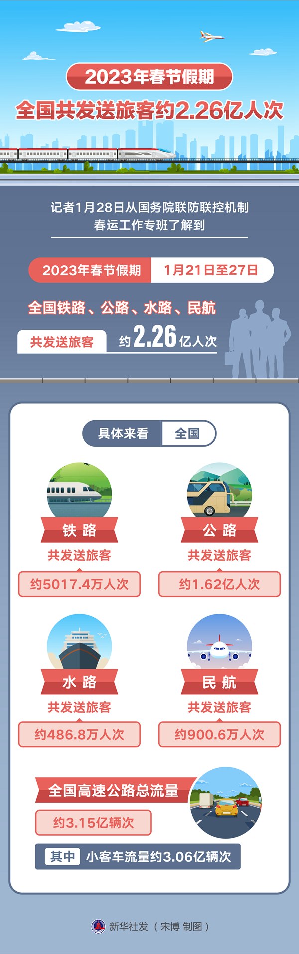 新華社北京1月28日電(記者葉昊鳴、樊曦)記者28日從國(guó)務(wù)院聯(lián)防聯(lián)控機(jī)制春運(yùn)工作專(zhuān)班了解到,2023年春節(jié)假期(1月21日至27日),全國(guó)鐵路、公路、水路、民航共發(fā)送旅客約2.26億人次。