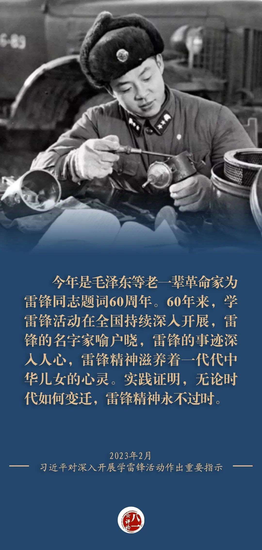 在毛澤東等老一輩革命家題詞60周年之際,習(xí)近平總書記又專門對深入開展學(xué)雷鋒活動作出重要指示,強(qiáng)調(diào)“無論時代如何變遷,雷鋒精神永不過時”,要“讓學(xué)雷鋒活動融入日常、化作經(jīng)常,讓雷鋒精神在新時代綻放更加璀璨的光芒”,為新時代更好弘揚(yáng)雷鋒精神指明了方向。