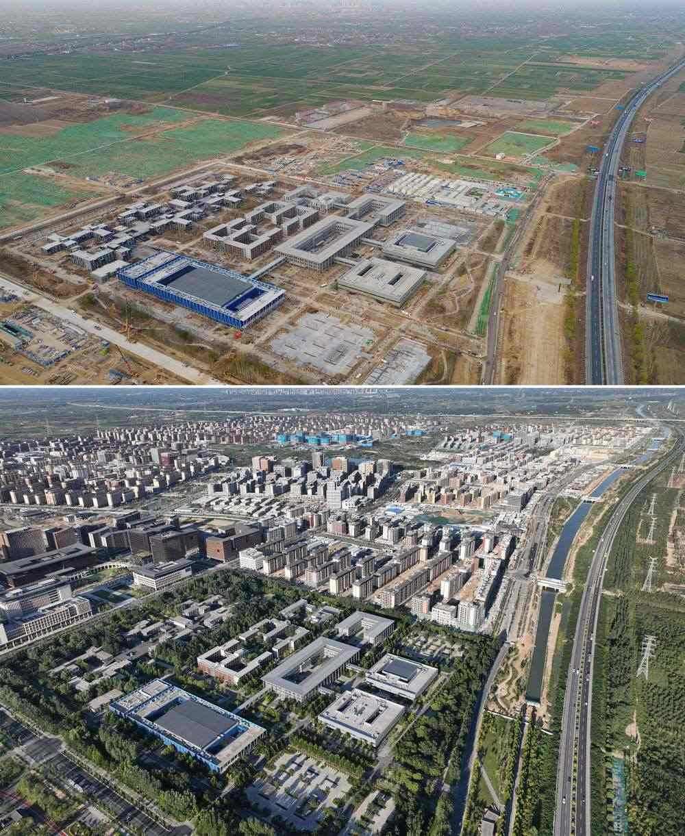 拼版照片:上圖為2017年3月的雄安新區(qū)容東片區(qū)衛(wèi)星圖;下圖為2022年9月的雄安新區(qū)容東片區(qū)衛(wèi)星圖。
