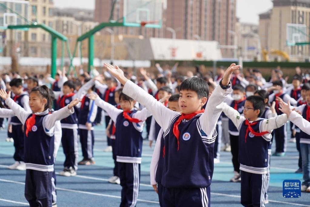 雄安新區(qū)容西片區(qū)云溪小學(xué)的學(xué)生在操場上做操(2023年3月23日攝)。新華社記者 牟宇 攝