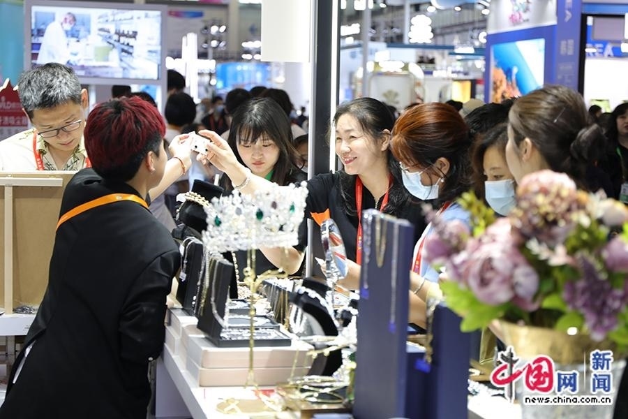4月11日,工作人員為觀眾介紹耳環(huán)、項鏈等飾品。中國網記者 吳亮 攝