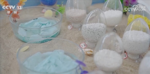 2020年海南以立法形式實施全域禁塑,在綠色消費展臺可以看到不同顏色的全降解材料。左邊的這個器皿里裝的是剛剛放進去的可降解塑料袋,右邊這個器皿展示的是它溶于水7天后的效果,現(xiàn)在已經(jīng)無法使用了,隨著時間的推移,最終可以完全變成二氧化碳和水。