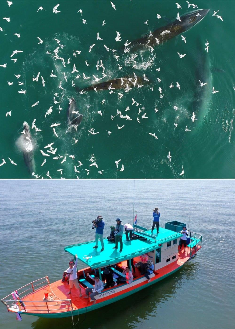 (拼版照片)上圖:布氏鯨在中國廣西潿洲島附近海域捕食(2022年2月22日攝)。下圖:中泰兩國科研人員在泰國灣對布氏鯨進(jìn)行聯(lián)合調(diào)查(2019年10月25日攝)。中泰兩國科研人員攜手研究保護(hù)布氏鯨這個近岸大型鯨類,圍繞布氏鯨調(diào)查技術(shù)、調(diào)查方法以及其他海洋哺乳動物的研究和數(shù)據(jù)處理方法進(jìn)行交流與合作。