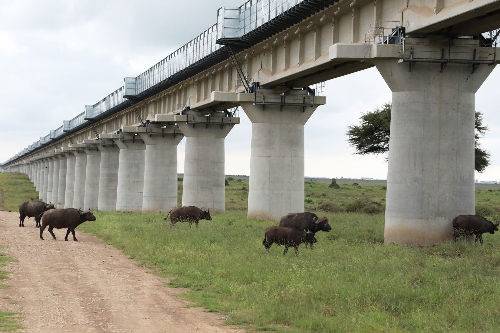 水牛在裝有聲屏障的肯尼亞內(nèi)羅畢國家公園特大橋下穿行(2021年5月19日攝)。中非共建的肯尼亞內(nèi)馬鐵路采用特大橋全程穿越內(nèi)羅畢國家公園方案,橋墩超過6米,讓長頸鹿也能“昂首通過”;特大橋護(hù)欄兩側(cè)安裝聲屏障,極大降低火車通過時的噪音。