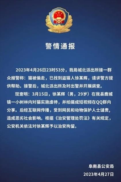 ·網(wǎng)紅偷貓后在小樹林虐殺,并拍短視頻在網(wǎng)上分享,警方通報(bào):依法予以治安拘留!