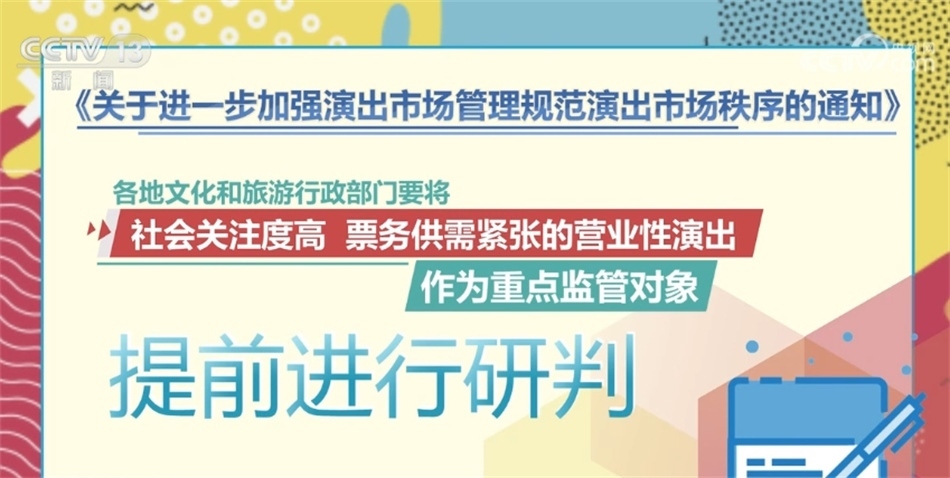 通知指出,各地文化和旅游行政部門要依法做好演出活動(dòng)的審批工作,將屬于營業(yè)性演出范圍的農(nóng)村集鎮(zhèn)演出、流動(dòng)性演出納入審批管理,嚴(yán)格審核演出舉辦單位的資質(zhì)文件,統(tǒng)一審批要求,做好內(nèi)容監(jiān)管。對(duì)不符合法定審批要求的,堅(jiān)決不予批準(zhǔn)。文化和旅游行政部門要定期對(duì)演出場(chǎng)所進(jìn)行檢查,督促演出場(chǎng)所定期開展設(shè)施設(shè)備檢查,落實(shí)安全生產(chǎn)責(zé)任制。督促演出場(chǎng)所建立完善現(xiàn)場(chǎng)巡查制度,指定專人負(fù)責(zé)演出活動(dòng)的巡查,做好現(xiàn)場(chǎng)觀眾管理,堅(jiān)決防止擁擠、踩踏等事故發(fā)生,確保演出現(xiàn)場(chǎng)安全。各地文化和旅游行政部門要將社會(huì)關(guān)注度高、票務(wù)供需緊張的營業(yè)性演出作為重點(diǎn)監(jiān)管對(duì)象,提前進(jìn)行研判。督促演出舉辦單位、演出票務(wù)經(jīng)營單位面向市場(chǎng)公開銷售的營業(yè)性演出門票數(shù)量,不得低于核準(zhǔn)觀眾數(shù)量的70%。對(duì)在票務(wù)經(jīng)營中發(fā)現(xiàn)有炒票問題或可能造成不良影響的,應(yīng)當(dāng)及時(shí)約談演出舉辦單位和演出票務(wù)經(jīng)營單位,督促整改。要聯(lián)合屬地公安、市場(chǎng)監(jiān)管等部門,依法打擊“黃?!背雌薄⑻摷傩麄鞯冗`法違規(guī)行為,切實(shí)保障消費(fèi)者合法權(quán)益。