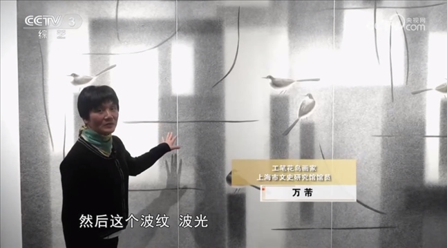工筆花鳥畫家 上海市文史研究館館員 萬芾:我們看到水泥柱子嘛,方的,這個(gè)波紋我是用山水畫里的披麻皴的皴法,形成水光瀲滟的效果,畫面也是用了一個(gè)比較抽象的點(diǎn)線面的元素來處理的,追求還是中國傳統(tǒng)繪畫里的氣韻生動,只是整個(gè)畫面第一感覺的形式讓人現(xiàn)代的感覺。