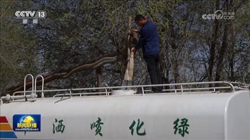 在甘肅八步沙林場,曾經(jīng)寸草不生的沙漠被嫩綠的沙生植物所覆蓋。眼下,林場職工正抓住時機(jī),為今年新栽的樹苗澆“安苗水”。