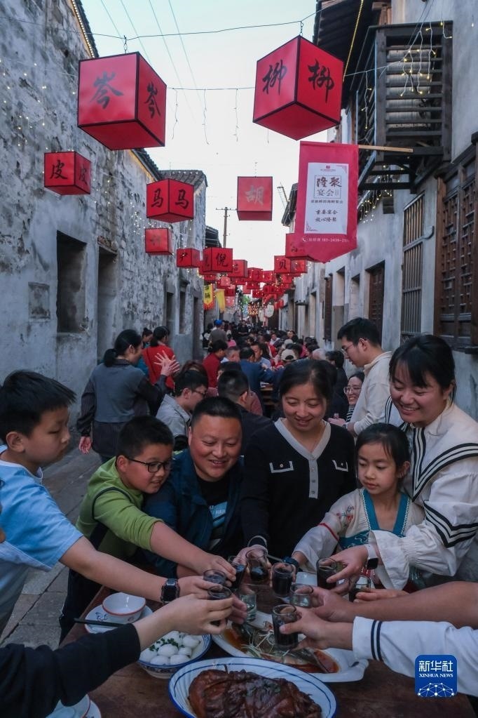 5月1日,在浙江嘉興桐鄉(xiāng)市崇福鎮(zhèn)運(yùn)河文化歷史街區(qū)的橫街上,游客參加古鎮(zhèn)特色長(zhǎng)街宴。