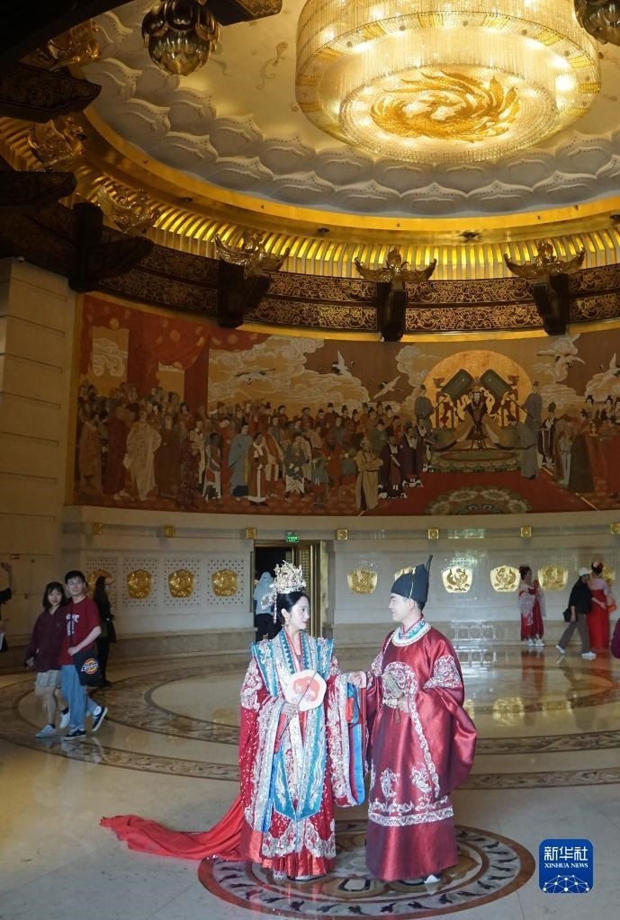 5月1日,兩名古裝愛(ài)好者在河南洛陽(yáng)隋唐洛陽(yáng)城國(guó)家遺址公園留影。