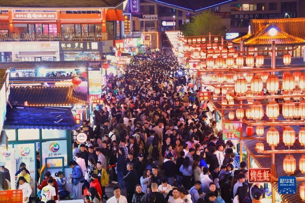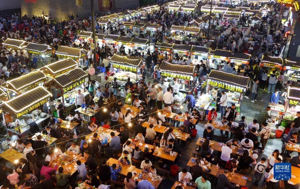 4月30日,游客在河南省開(kāi)封市鼓樓夜市品嘗小吃。