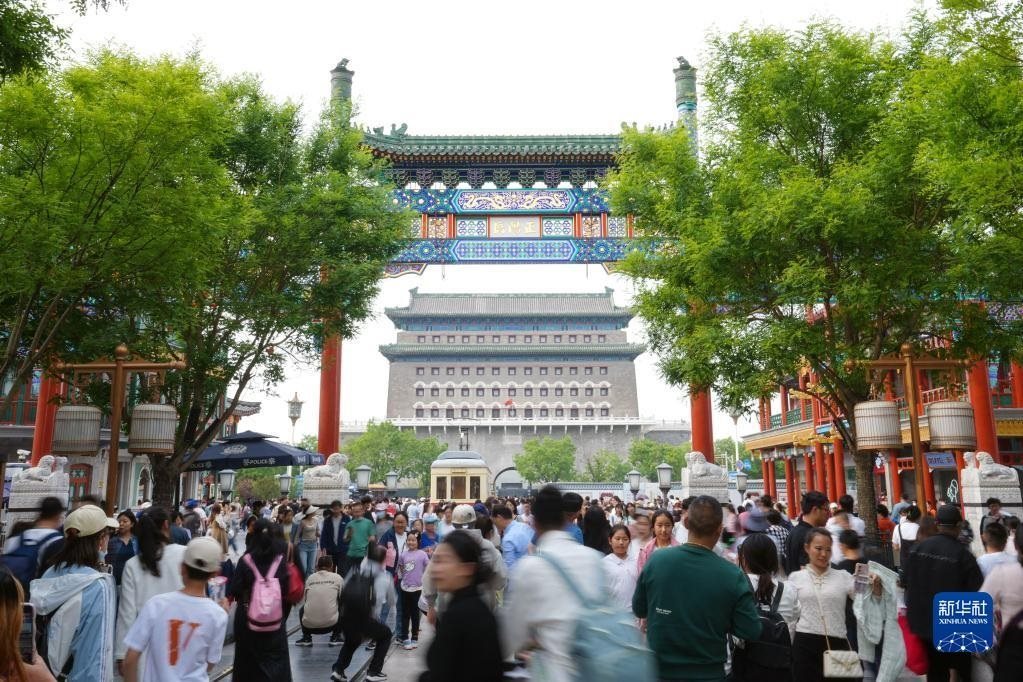 5月1日,游客在北京前門(mén)大街參觀游覽。