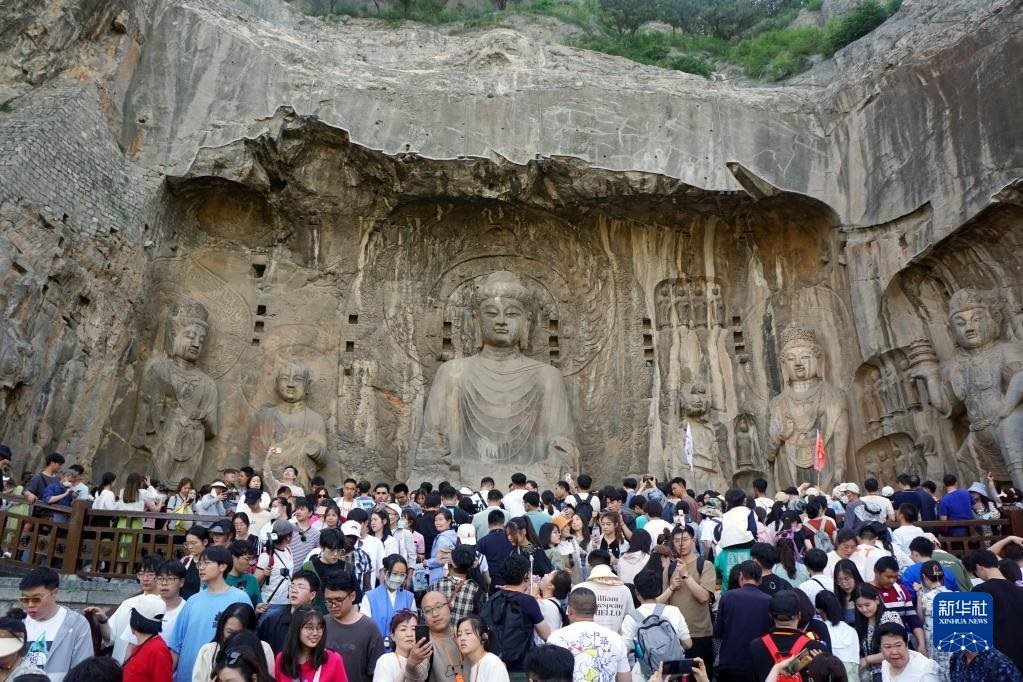 4月30日,游客在河南洛陽(yáng)龍門(mén)石窟景區(qū)游覽。