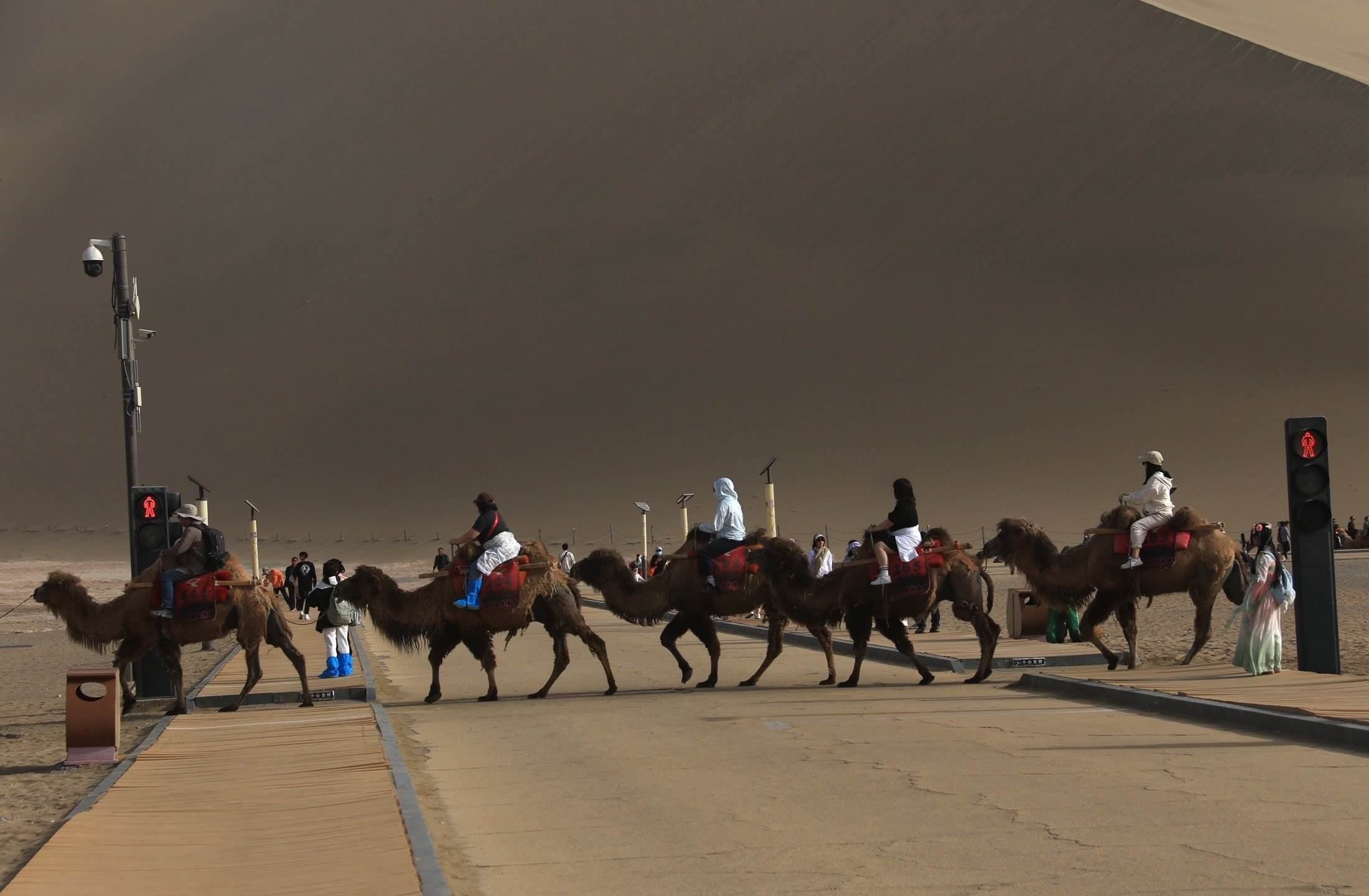 “五一”假期,甘肅省敦煌市鳴沙山月牙泉景區(qū)迎來旅游高峰。設置在該景區(qū)內(nèi)行人步道和駱駝通道兩個交叉點的“駱駝紅綠燈”,引導人、車和駱駝有序分流,不僅確保了景區(qū)交通安全暢通,也成為景區(qū)內(nèi)的“網(wǎng)紅打卡點”之一 。