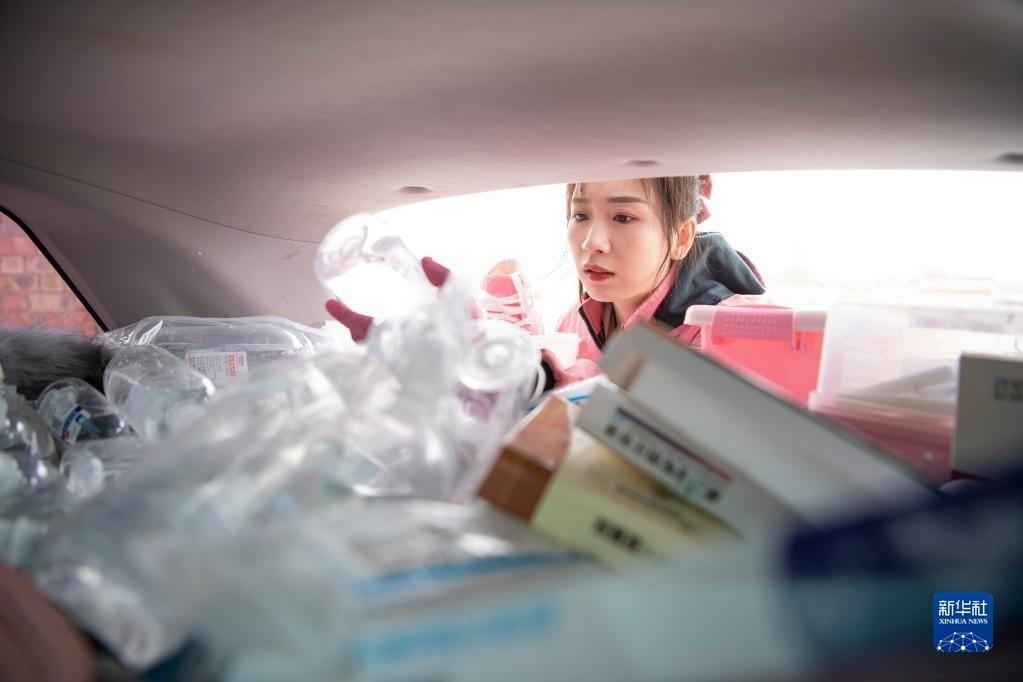 白婳從汽車后備箱里拿出藥品(4月18日攝)。