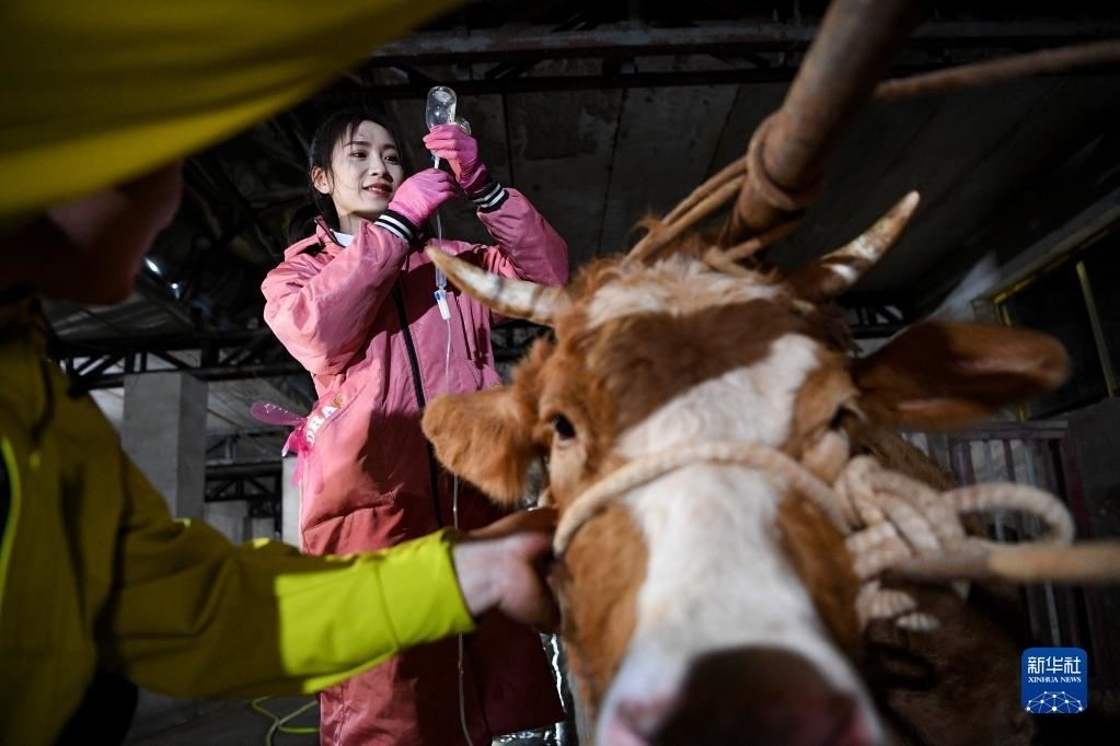晚上10點(diǎn)多,白婳在固原市原州區(qū)開城鎮(zhèn)和泉村為一頭牛輸液(4月17日攝)。