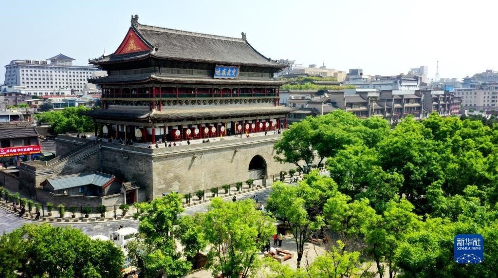 西安鐘樓(5月1日攝,無人機(jī)照片)。
