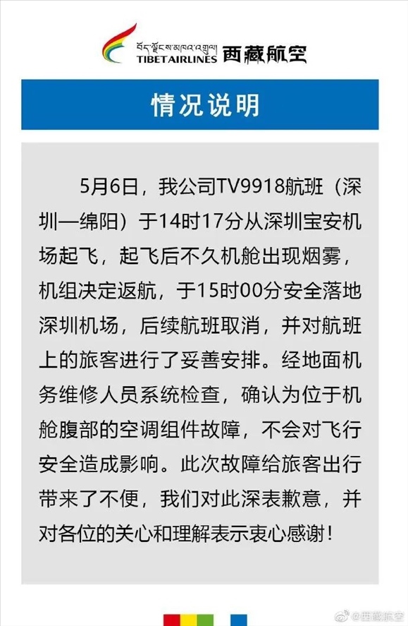 ·西藏航空回應(yīng)飛機(jī)內(nèi)出現(xiàn)濃煙返航:空調(diào)組件故障。