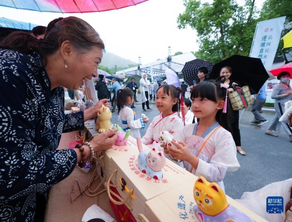 5月6日,居民在非遺集市展示手工藝品“半山泥貓”。
