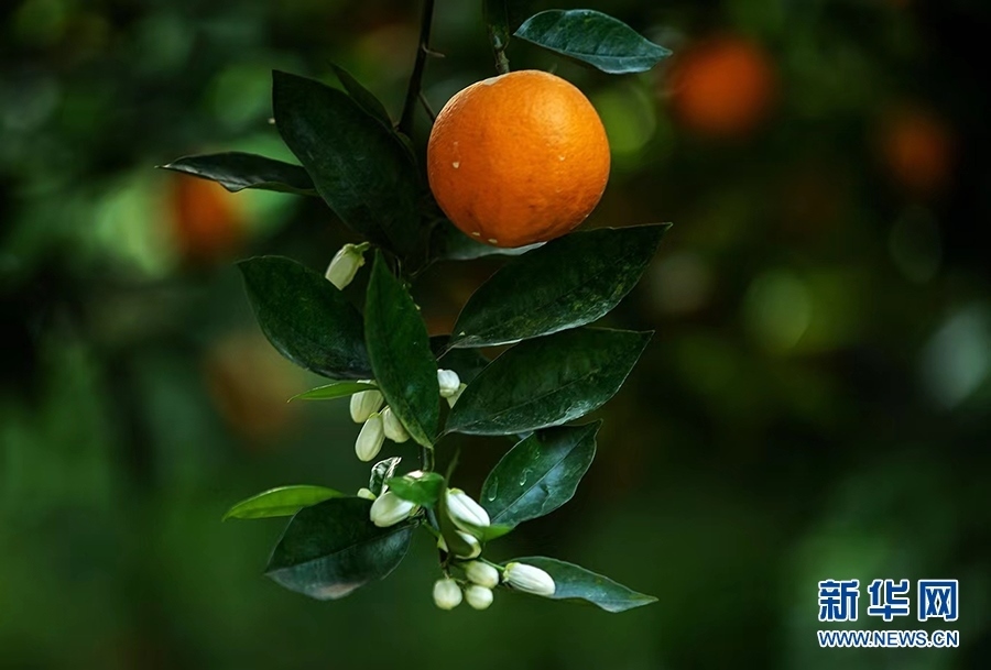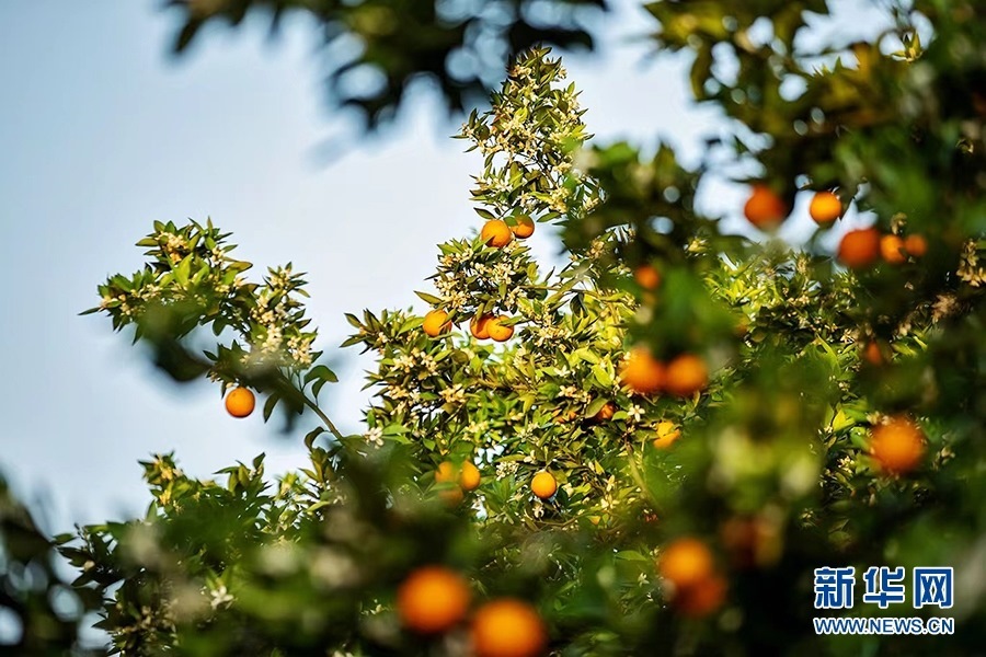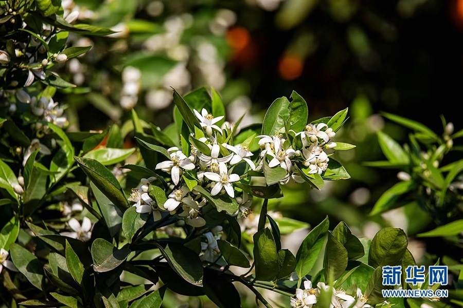 柑橘園里,濃郁的花香隨風(fēng)四溢,金燦燦的柑橘掩映在枝葉中,星星點點的小白花點綴其間,花香和果香交織沁人心脾。新華網(wǎng)發(fā)(余鴻 攝)