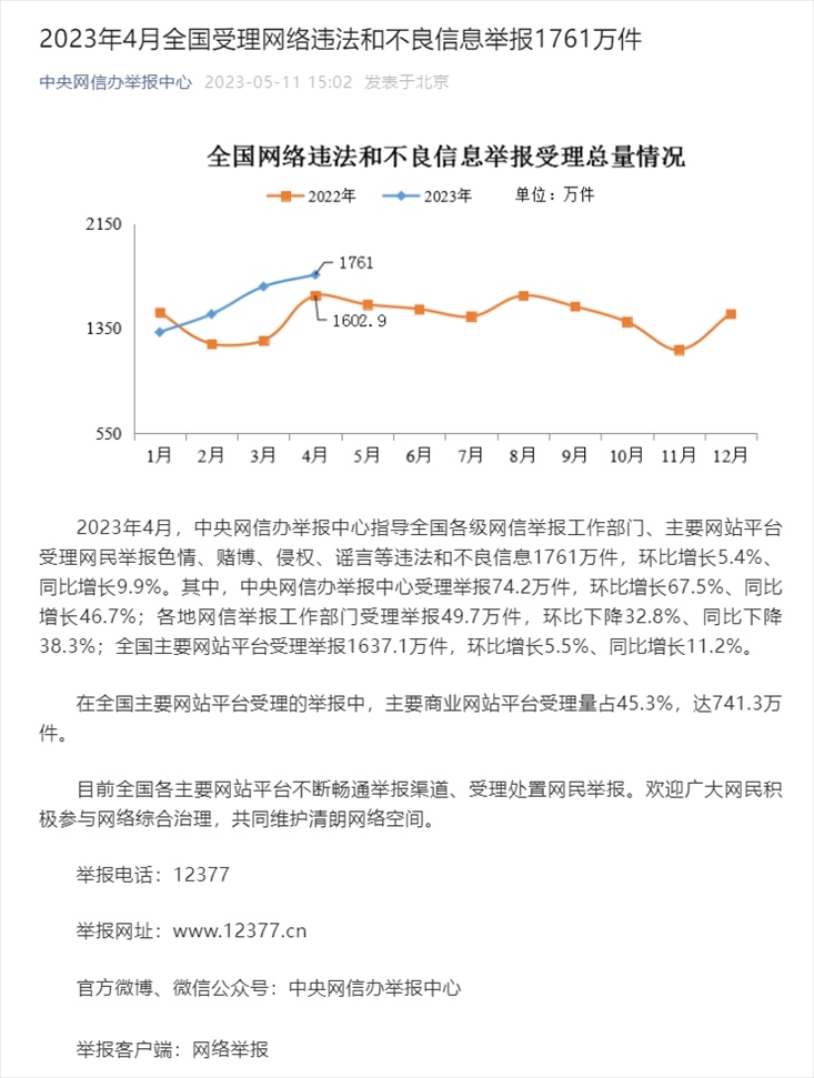 央視網(wǎng)消息:據(jù)中央網(wǎng)信辦舉報(bào)中心,2023年4月,中央網(wǎng)信辦舉報(bào)中心指導(dǎo)全國各級(jí)網(wǎng)信舉報(bào)工作部門、主要網(wǎng)站平臺(tái)受理網(wǎng)民舉報(bào)色情、賭博、侵權(quán)、謠言等違法和不良信息1761萬件,環(huán)比增長5.4%、同比增長9.9%。其中,中央網(wǎng)信辦舉報(bào)中心受理舉報(bào)74.2萬件,環(huán)比增長67.5%、同比增長46.7%;各地網(wǎng)信舉報(bào)工作部門受理舉報(bào)49.7萬件,環(huán)比下降32.8%、同比下降38.3%;全國主要網(wǎng)站平臺(tái)受理舉報(bào)1637.1萬件,環(huán)比增長5.5%、同比增長11.2%。