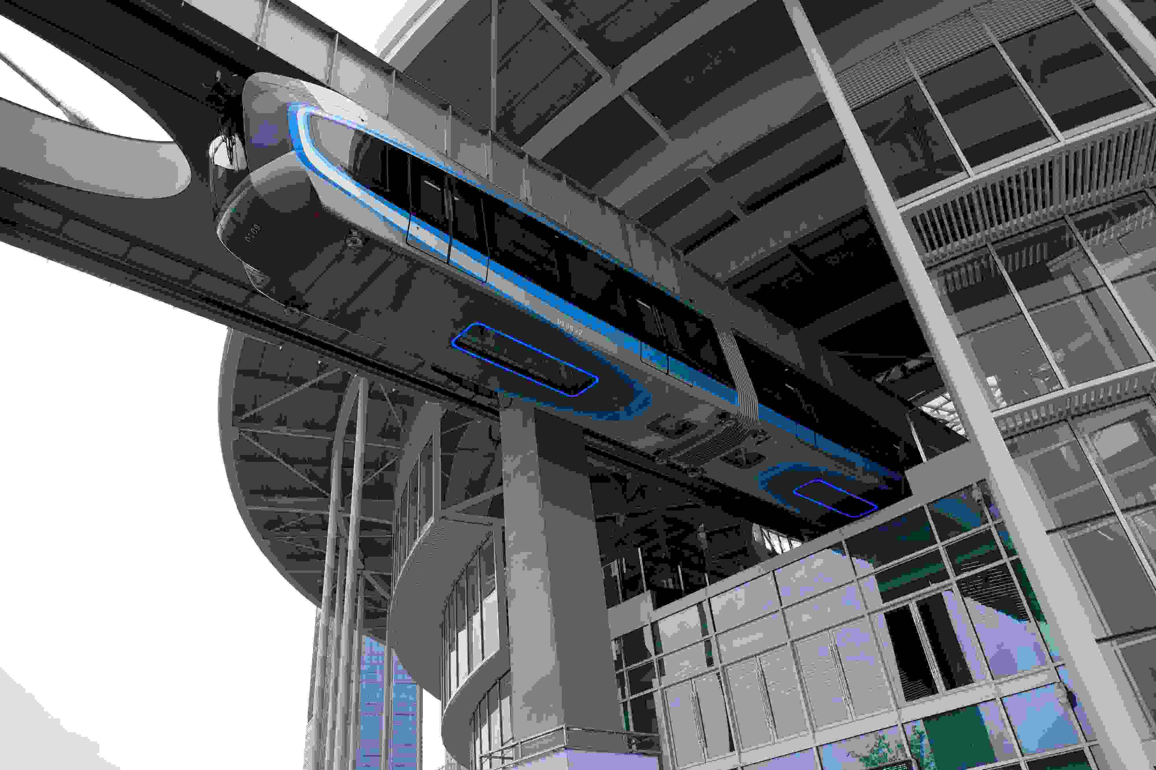 2023年5月11日,武漢,光谷空軌旅游線項目“光谷光子號”空中軌道列車在東湖高新區(qū)試跑。武漢光谷空軌旅游線項目位于武漢市東湖高新區(qū)光谷中央生態(tài)大走廊內(nèi),是生態(tài)大走廊旅游配套基礎(chǔ)設(shè)施之一。其規(guī)劃總長26.7公里,先行建設(shè)的一期工程長約10.5公里,設(shè)車站6座。 視覺中國
