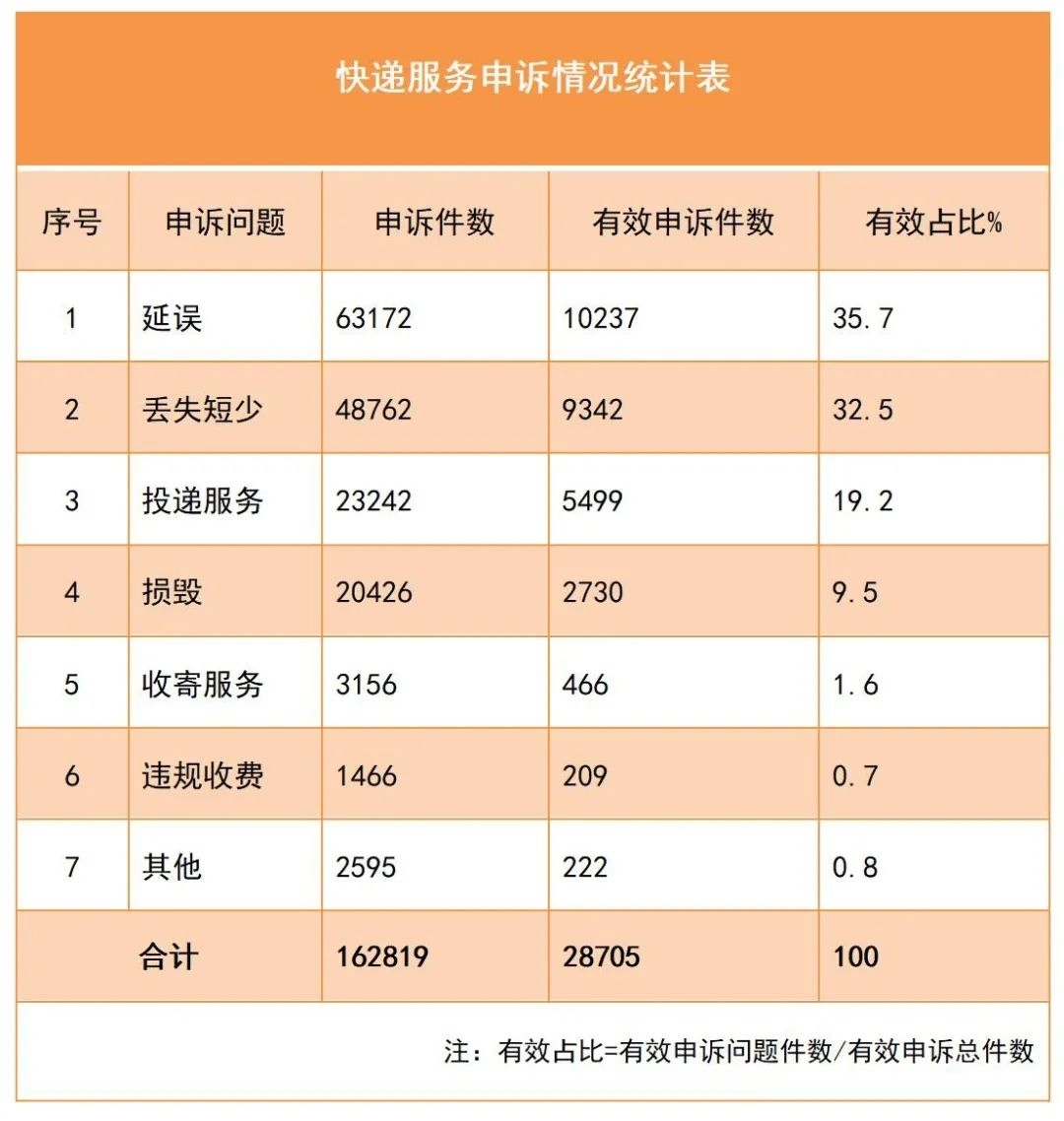 1.快遞服務(wù)申訴問題數(shù)量與類別情況。用戶對(duì)快遞服務(wù)問題申訴162819件,其中有效申訴28705件,涉及的主要問題依次是快件延誤、快件丟失短少和投遞服務(wù),分別占有效申訴總量的35.7%、32.5%和19.2%。