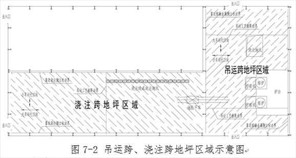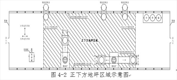 注:“正下方地坪區(qū)域”是指橫向以吊運跨兩側(cè)立柱靠近熔融金屬吊運側(cè)的立柱邊線為界,縱向以吊運跨最兩端的鐵水、鋼水、液渣吊運工藝極限邊界為界的車間地坪區(qū)域(圖4-2)。