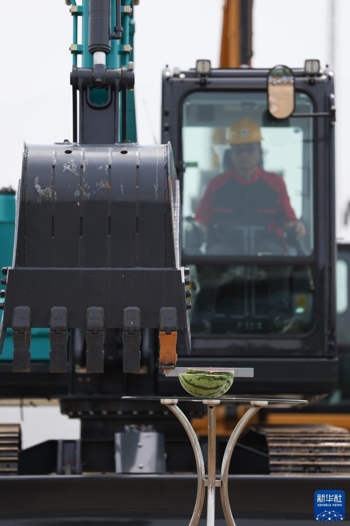 5月13日,在長沙國際工程機(jī)械展覽會(huì)上,機(jī)手駕駛挖掘機(jī)切西瓜。