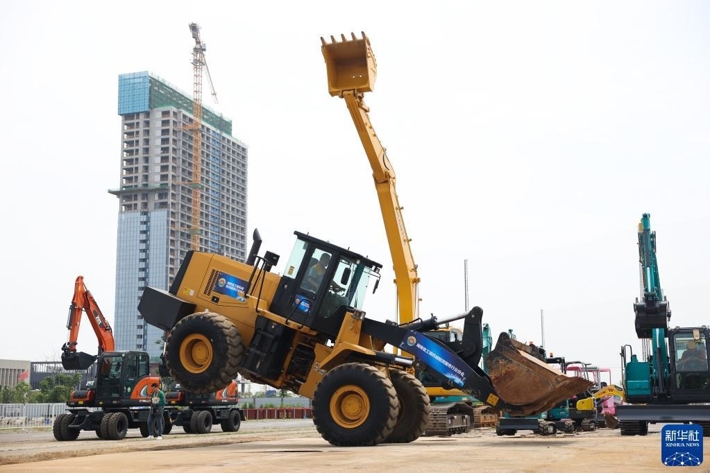 5月13日,在長沙國際工程機(jī)械展覽會(huì)上,機(jī)手駕駛挖掘機(jī)“比心”。