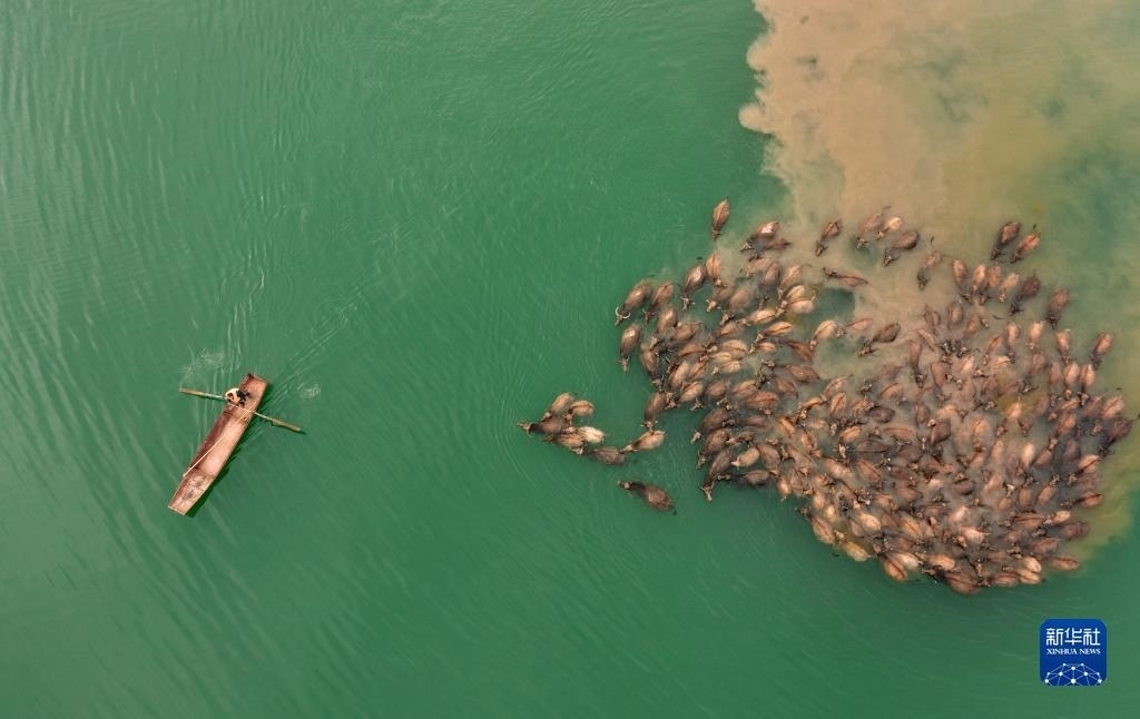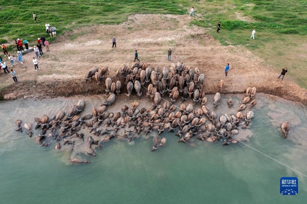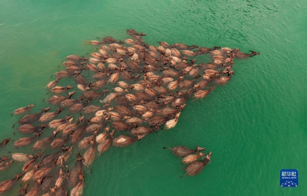 5月13日,在南充市蓬安縣相如鎮(zhèn)油房溝村嘉陵江段,成群結(jié)隊的水牛渡江(無人機照片)。