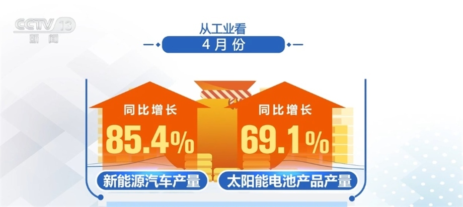 從工業(yè)看,4月份,全國規(guī)模以上工業(yè)增加值同比增長5.6%,比上月加快1.7個百分點(diǎn),其中,新能源汽車、太陽能電池產(chǎn)品產(chǎn)量同比分別增長85.4%和69.1%。