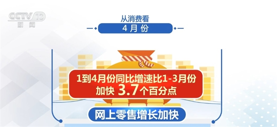 從消費(fèi)看,4月份,社會消費(fèi)品零售總額同比增長18.4%,比上月加快7.8個百分點(diǎn)。其中,網(wǎng)上零售增長加快,1—4月份同比增速比1—3月份加快3.7個百分點(diǎn)。