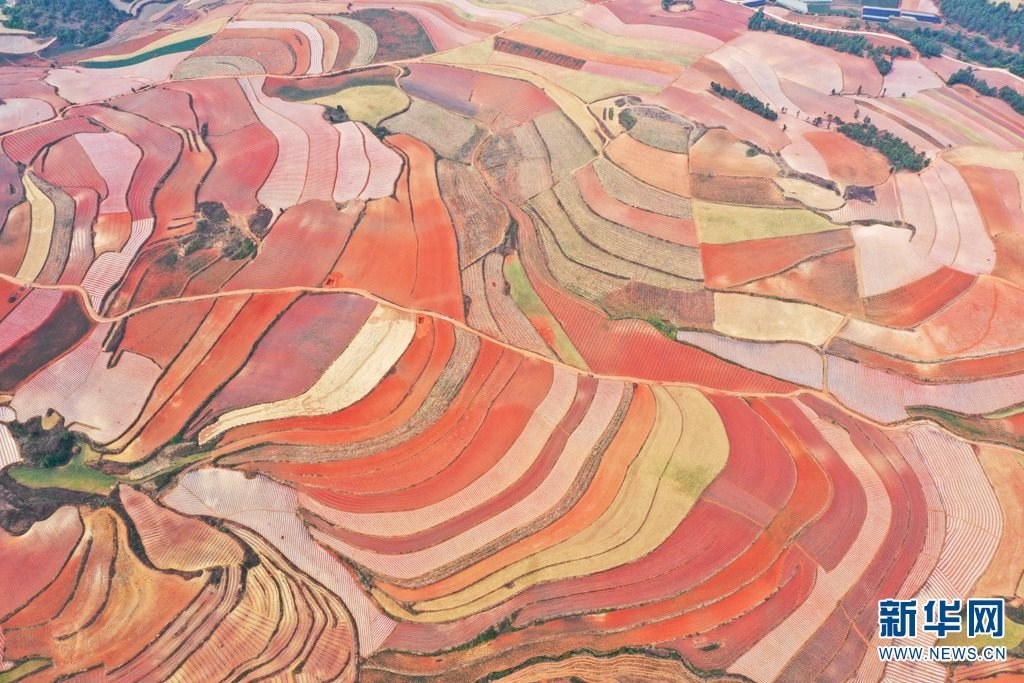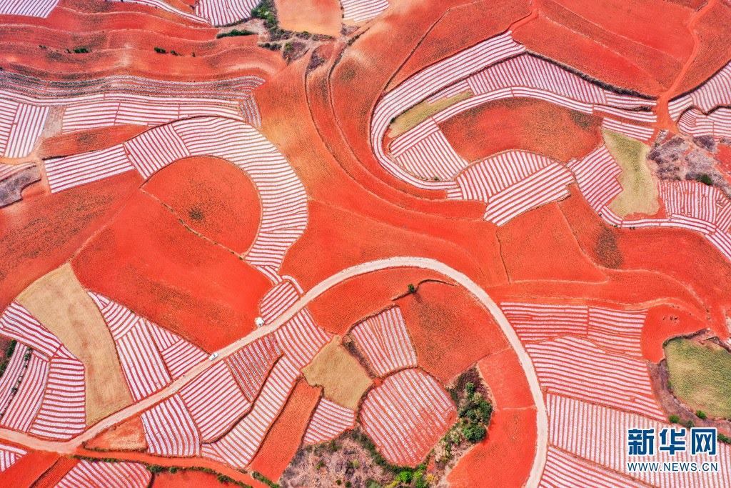 云南省尋甸回族彝族自治縣,連綿不斷的旱梯田遍布山間,遠(yuǎn)接天邊,每年4-5月,經(jīng)過村民翻新、平整后的紅褐色土地,從空中俯瞰五彩斑斕、蔚為壯觀。當(dāng)?shù)卮迕裥燎诟旁诜饰值募t土地上,用勤勞的雙手,繪就一幅幅勞動(dòng)藝術(shù)畫作。新華網(wǎng)發(fā)(孫文來 攝影報(bào)道)