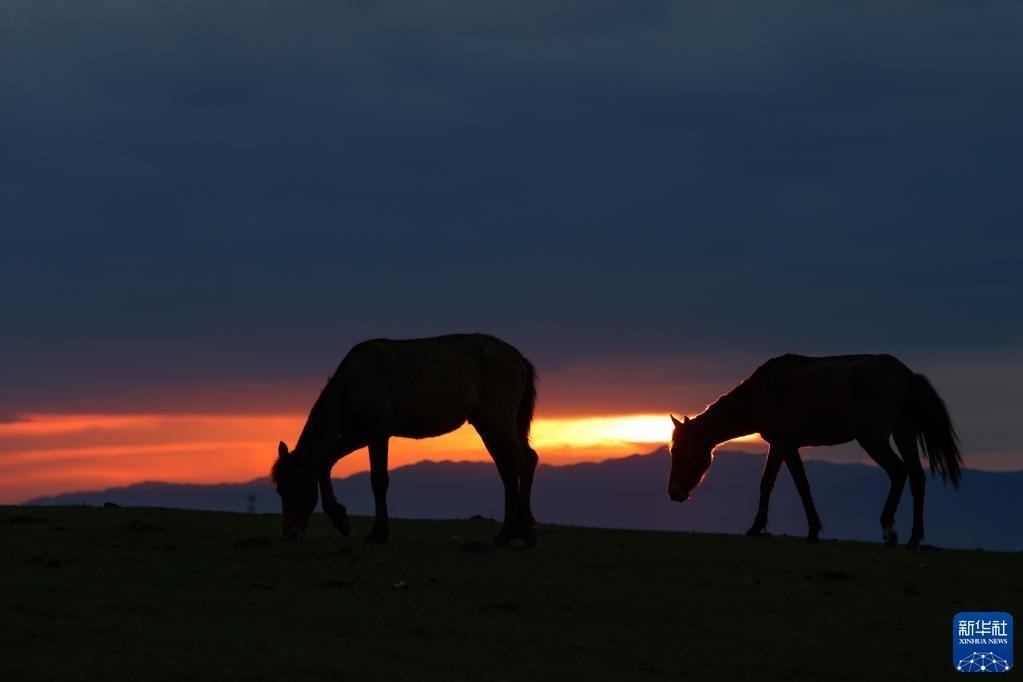 5月20日,夕陽(yáng)下的那拉提草原上,馬在吃草。   新華社記者 郝昭 攝