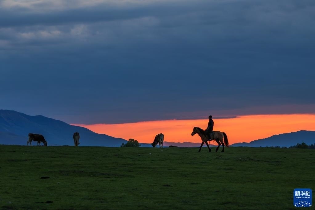 5月20日,夕陽(yáng)下的那拉提草原上,牧民騎馬牧歸。   新華社記者 郝昭 攝