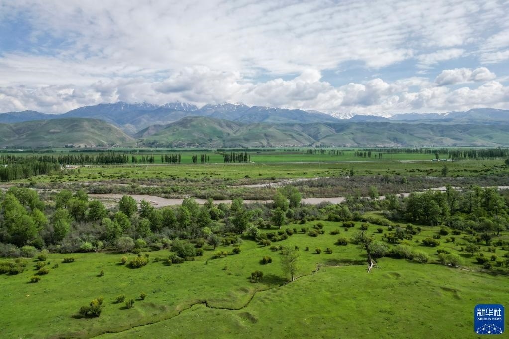 5月20日拍攝的那拉提河谷草原風(fēng)光(無(wú)人機(jī)照片)。   新華社記者 郝昭 攝