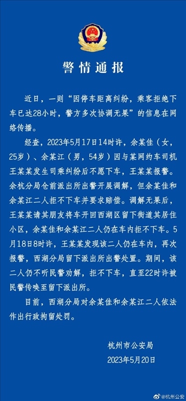 ·近日,杭州兩名乘客與網約車司機發(fā)生糾紛,賴在車上不走超過28小時,警方多次調解無果,最終兩名乘客被處以行政拘留。