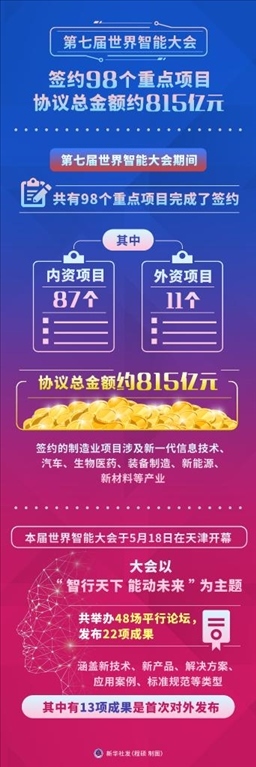 ·第七屆世界智能大會(huì)簽約98個(gè)重點(diǎn)項(xiàng)目,協(xié)議總金額約815億元。