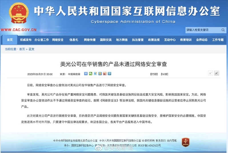 ·影響我國(guó)國(guó)家安全,美光公司在華銷(xiāo)售的產(chǎn)品未通過(guò)網(wǎng)絡(luò)安全審查。按照《網(wǎng)絡(luò)安全法》等法律法規(guī),我國(guó)內(nèi)關(guān)鍵信息基礎(chǔ)設(shè)施的運(yùn)營(yíng)者應(yīng)停止采購(gòu)美光公司產(chǎn)品。