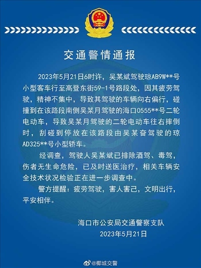·??诮痪▓?bào)“一車(chē)輛沖上綠化帶撞倒環(huán)衛(wèi)工人”:司機(jī)疲勞駕駛,傷者無(wú)生命危險(xiǎn)。