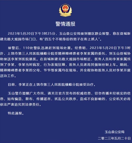 ·江西玉山警方通報(bào)“男子街上抓人”:系醫(yī)院接送精神障礙患者就醫(yī)。